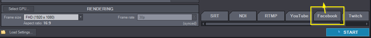 The settings for streaming to Facebook work almost the same in Aximmetry as in the previous example, except that you have to drag and drop Facebook in the Startup Configuration window: