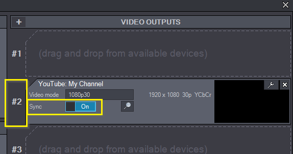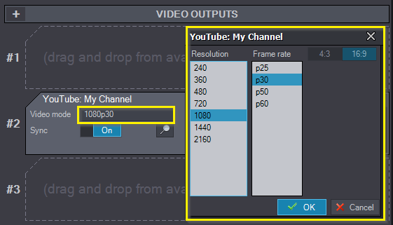 In the Startup Configuration window, drag and drop a YouTube output into Video Outputs at index #2: