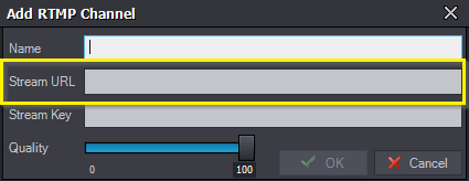 In the stream information, specify a Name for your output, ensure the Stream URL matches the Stream URL on your YouTube page (as in the picture above), and enter the unique Stream Key from your YouTube page (as in the picture above):