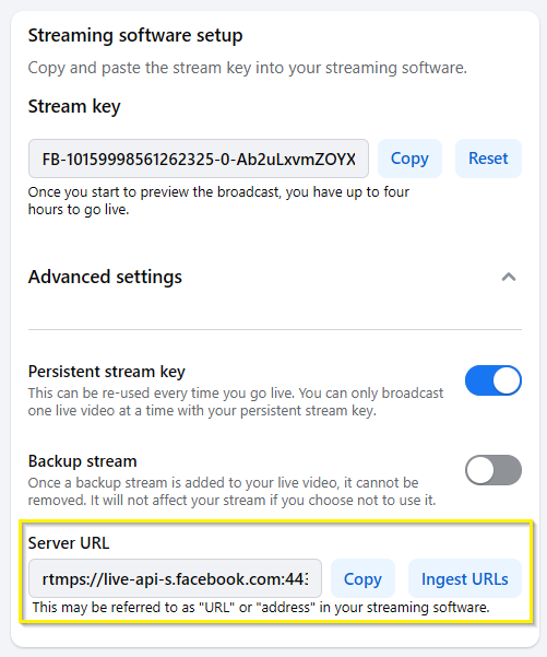 Make sure that the Stream URL in Aximmetry matches the Server URL provided on your Facebook page, as Facebook may occasionally change the URL: