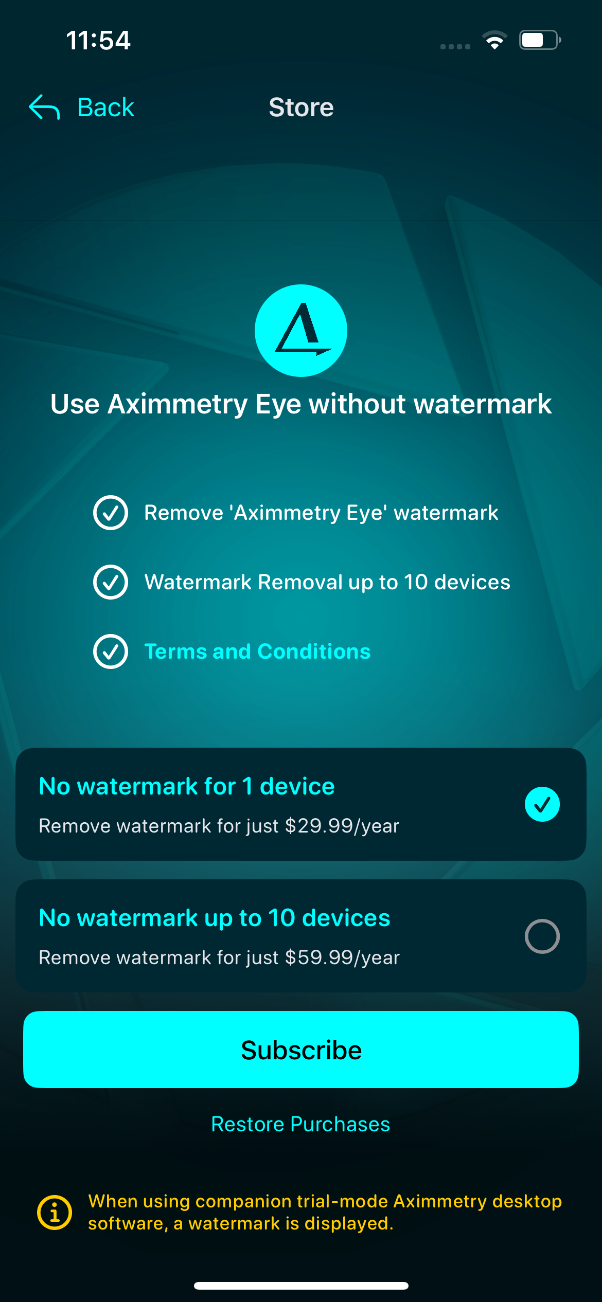 - Aximmetry Eye is freely accessible with all its functions and capabilities. The free version applies a watermark to all of the video feeds. If you wish to remove the watermark, you can do so by purchasing a subscription from the application.