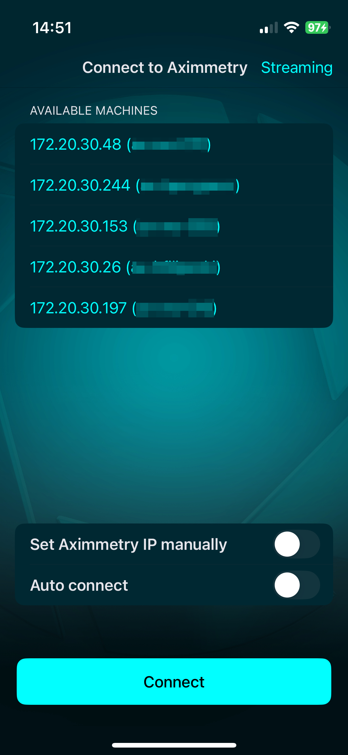 Aximmetry Eye lists all the available Aximmetry connections on your network.