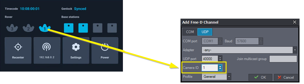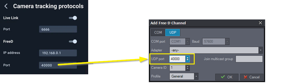 After that, in the Add Free-D Channel window that appears, enter the UDP port number shown on the Camera Tracking Protocols screen of the Mars dashboard.