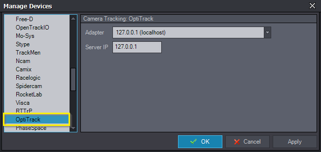 After configuring the above, all OptiTrack rigid bodies should be listed within 1–2 seconds in the Camera Tracking tab of the Available Input Devices, or any relevant dropdown list for selecting a tracking device in Aximmetry.